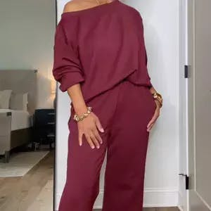 This ultra-soft two-piece set features a slouchy off-shoulder top and high-waisted wide-leg pants that flatter every shape!